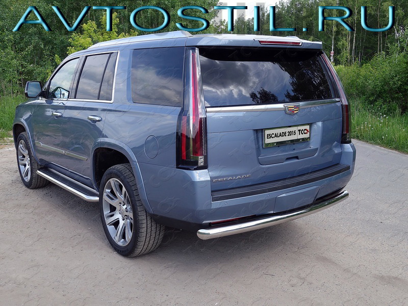 Cadillac Escalade 2015 защита заднего бампера труба d76мм. Защита бампера устанавливается на раму внедорожника в штатные места крепления, предусмотренные заводом производителем. Для установки защиты бампера Cadillac Escalade 2015 необходимо обратиться в сервисный центр или воспользоваться гаечными ключами и установить самостоятельно. Весь необходимый комплект креплений (крепления, гайки, болты, шайбы) и инструкция идут в комплекте с изделием. Cadillac Escalade 2015 задняя защита изготовлена из нержавеющей стали, которая не требует ежедневного ухода за ней. Крепления произведены из обычной черной" стали толщиной 8мм.