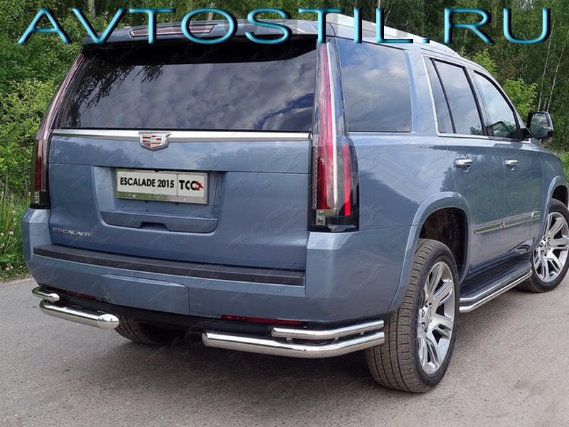 Задний обвес Cadillac Escalade 2015 углы двойные d76/42мм. Защита бампера устанавливается на раму внедорожника в штатные места крепления, предусмотренные заводом производителем. Для установки защиты бампера Cadillac Escalade 2015 необходимо обратиться в сервисный центр или воспользоваться гаечными ключами и установить самостоятельно. Весь необходимый комплект креплений (крепления, гайки, болты, шайбы) и инструкция идут в комплекте с изделием. Cadillac Escalade 2015 задняя защита бампера изготовлена из нержавеющей стали, которая не требует ежедневного ухода за ней. Крепления произведены из обычной черной" стали толщиной 4мм.