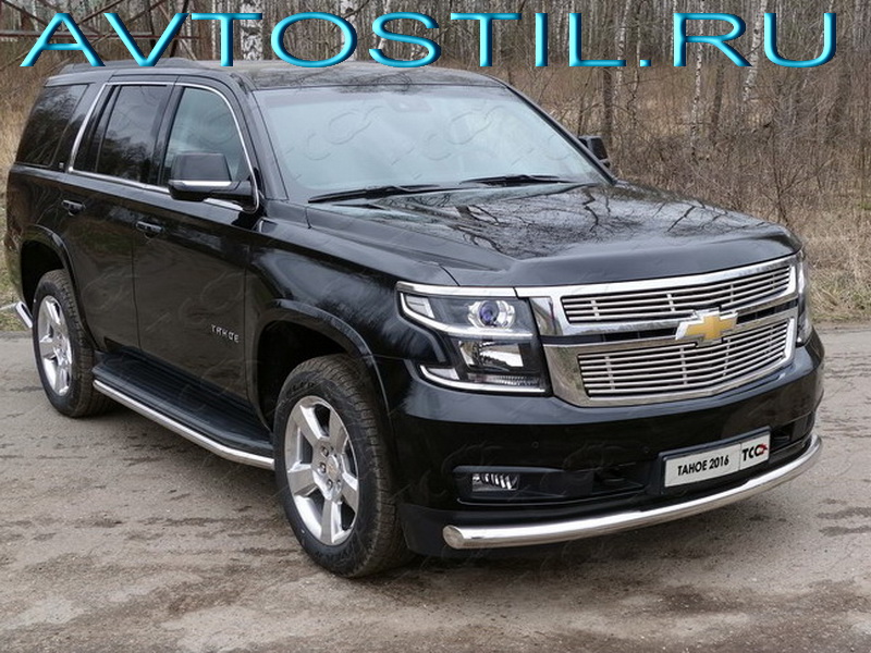 Передняя защита Chevrolet Tahoe 2016- труба d76мм пр-во фирмы "Руссталь". Защита переднего бампера Chevrolet Tahoe 2016 устанавливается на раму внедорожника в штатные места крепления, предусмотренные заводом производителем. Для установки защиты бампера Шевроле Тахо 2016- необходимо обратиться в сервисный центр или воспользоваться гаечными ключами и установить самостоятельно. Весь необходимый комплект креплений (крепления, гайки, болты, шайбы) и инструкция идут в комплекте c изделием. Передняя защита на Chevrolet Tahoe 2016 изготовлена из нержавеющей стали, которая не требует ежедневного ухода за ней. Крепления произведены из обычной черной" стали толщиной 6мм.