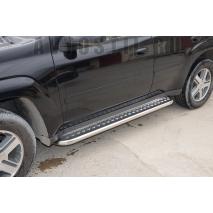 Chevrolet Trailblazer пороги труба d60мм с алюминиевым листом. Боковые подножки на Chevrolet Trailblazer устанавливаются на лонжероны внедорожника в штатные места крепления, предусмотренные заводом производителем. Для установки порогов на Chevrolet Trailblazer необходимо обратиться в сервисный центр или воспользоваться гаечными ключами и установить самостоятельно. Весь необходимый комплект креплений (крепления, гайки, болты, шайбы) и инструкция идут в комплекте с изделием. Пороги на Chevrolet Trailblazer изготовлены из нержавеющей стали, которая не требует ежедневного ухода за ней. Крепления произведены из обычной черной" стали толщиной 8мм.
