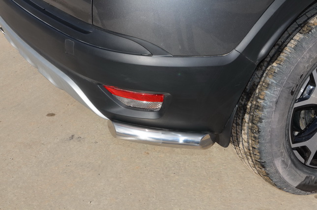 Защита заднего бампера на Renault Kaptur 2016 уголки d60мм пр-во компании UKK. Защита бампера устанавливается на лонжероны внедорожника в штатные места крепления, предусмотренные заводом производителем. Для установки защиты бампера необходимо обратиться в сервисный центр или воспользоваться гаечными ключами и установить самостоятельно. Весь необходимый комплект креплений (крепления, гайки, болты, шайбы) и инструкция идут в комплекте с изделием. Задняя защита на Рено Каптур 2016 изготовлена из нержавеющей стали, которая не требует ежедневного ухода за ней. Крепления произведены из обычной черной" стали толщиной 6мм.