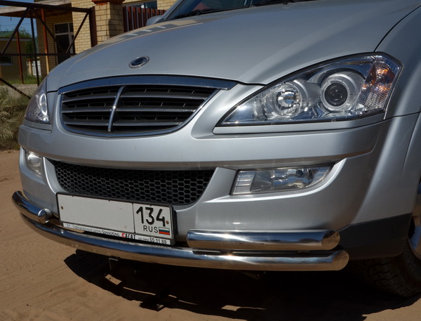 Ssang Yong Kyron защита переднего бампера труба d76/60мм с уголками. Передняя защита бампера на Kyron устанавливается на лонжероны внедорожника в штатные места крепления, предусмотренные заводом производителем. Для установки защиты бампера Кайрон необходимо обратиться в сервисный центр или воспользоваться гаечными ключами и установить самостоятельно. Весь необходимый комплект креплений (крепления, гайки, болты, шайбы) и инструкция идут в комплекте с изделием. Ssang Yong Kyron передняя защита изготовлена из нержавеющей стали, которая не требует ежедневного ухода за ней. Крепления произведены из обычной черной" стали толщиной 8мм.
