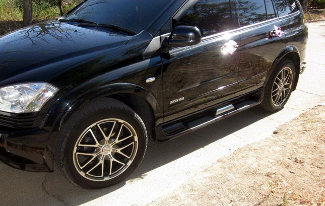 Sang Yong Kyron пороги оригинальные из прочного пластика с металлическими креплениями. Подножки на Kyron устанавливаются на лонжероны внедорожника в штатные места крепления, предусмотренные заводом производителем. Для установки порогов на Kyron необходимо обратиться в сервисный центр или воспользоваться гаечными ключами и установить самостоятельно. Весь необходимый комплект креплений (крепления, гайки, болты, шайбы) и инструкция идут в комплекте с изделием. Kyron пороги изготовлены из прочного ударостойкого пластика с накладками для ног, исключающими скольжение. Крепления произведены из обычной черной" стали толщиной 8мм.