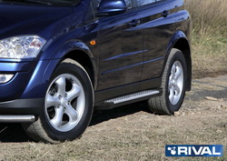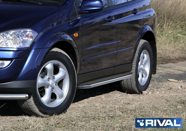 Подножки Premium Ssang Yong Kyron с торцевой отделкой из нержавеющей стали. Пороги Premium на Ssang Yong Kyron устанавливаются на лонжероны внедорожника в штатные места крепления, предусмотренные заводом производителем. Для установки порогов на санг енг кайрон необходимо обратиться в сервисный центр или воспользоваться гаечными ключами и установить самостоятельно. Весь необходимый комплект креплений (крепления, гайки, болты, шайбы) и инструкция идут в комплекте с изделием. Ssang Yong Kyron подножки изготовлены из прочного алюминиевого профиля, сверху предусмотрена резиновая накладка, исключающая скольжение ноги. Крепления произведены из обычной черной" стали толщиной 4мм.